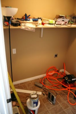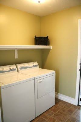 I love it. That is exactly what my laundry room looks like, well the size and the placement of the washer and dryer and shelf. I am going to have to do this.