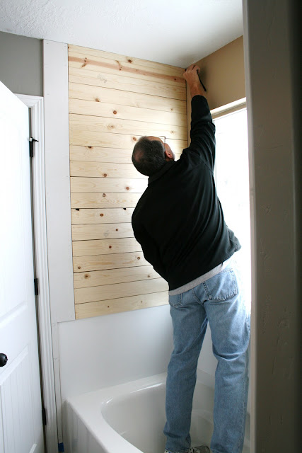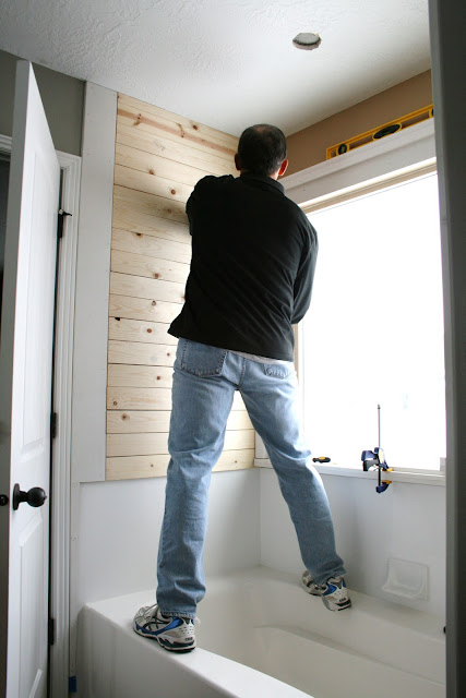 I think it looks a bit "sauna - ish" right now. LOL... with the wood planks NOT painted... so hopefully I'll get the look I'm going for, once everything is painted white, and we have a really neat lighting fixture over the tub!