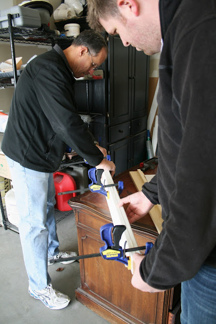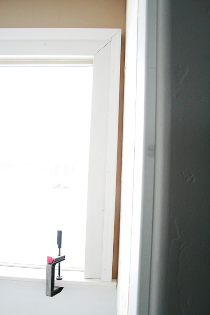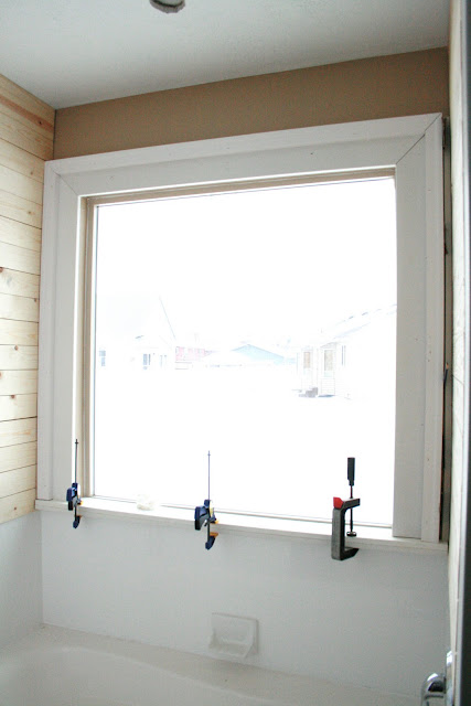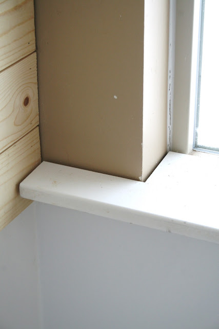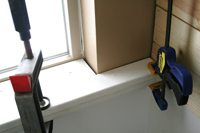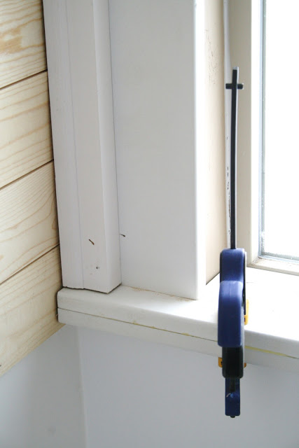 I actually wanted a thicker looking ledge for this window, so Cason just glued a smaller piece of board underneath our already cut board... to "chunky it up" a bit.