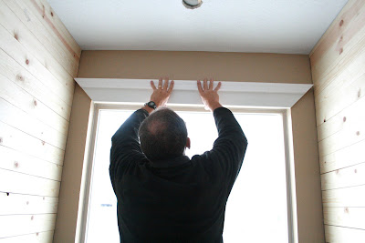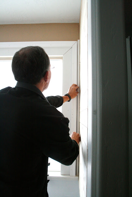 We knew we wanted to do that FIRST... so that when we put up the chunky frame around the window, we wouldn't have to worry about working around the frame... and could just set molding on top of the wood slats.