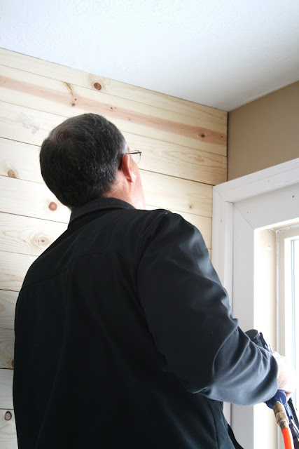 And we also have to finish putting up the last few planks above the window, with a piece of quarter round on the top... between the ceiling and boards... to finish it off.
